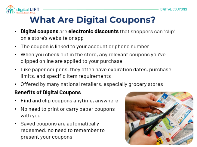Help learners save money on groceries and household items by teaching them to find, clip, and use digital coupons in store apps like Safeway. Purchase to teach this workshop in your community.