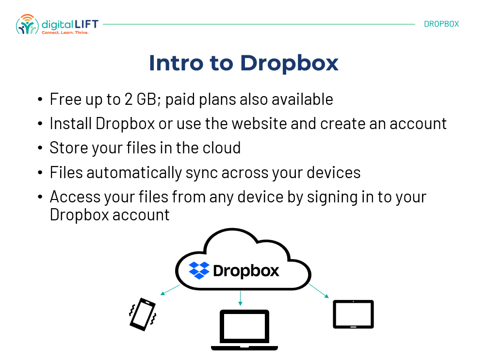 Help learners understand device and cloud storage while exploring digital storage units, checking available space, and learning how to save, organize, and share files using Dropbox. Purchase to teach this workshop in your community.