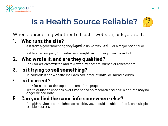 Help learners explore digital tools for health by finding reliable information, tracking wellness, using fitness and mental health apps, and connecting with healthcare providers online. Purchase to teach this workshop in your community.