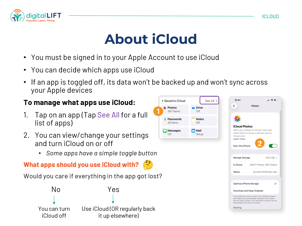 1) Storage basics 2) Intro to iCloud 3) iCloud Photos 4) iCloud Backup 5) Practice