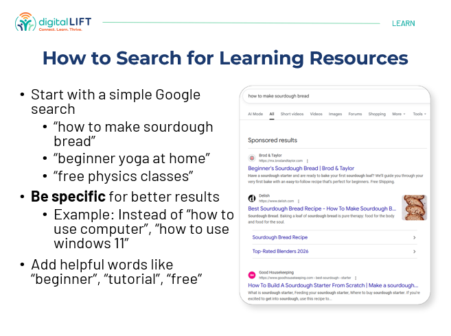 Show learners how to access free educational resources to learn new skills, explore interests, and build knowledge online. Purchase to teach this workshop in your community.