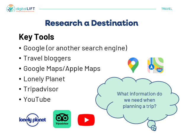 1) Researching a destination online 2) Making an itinerary 3) Buying tickets 4) Booking hotels 5) General advice