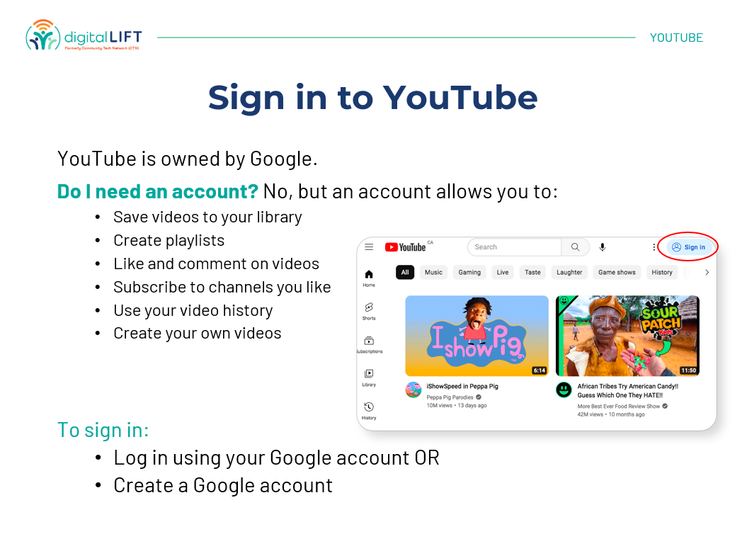 This curriculum is designed for beginners, especially adults with limited experience using YouTube or other streaming services The practice activities in the workshop require basic device skills, such as clicking/tapping and typing.